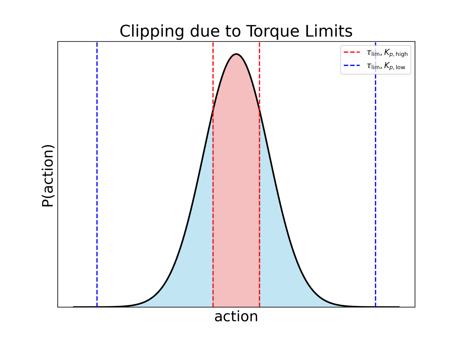 In the high-gain case, it’s going to be the red dotted lines. Because of our torque limits and our gains being as high as they are, when you do your random sampling over your untrained policy, the bandwidth, the range of values that you can sample, where you change the position of the actuator, or where you have a difference in output torque before it gets clipped, is very, very small.