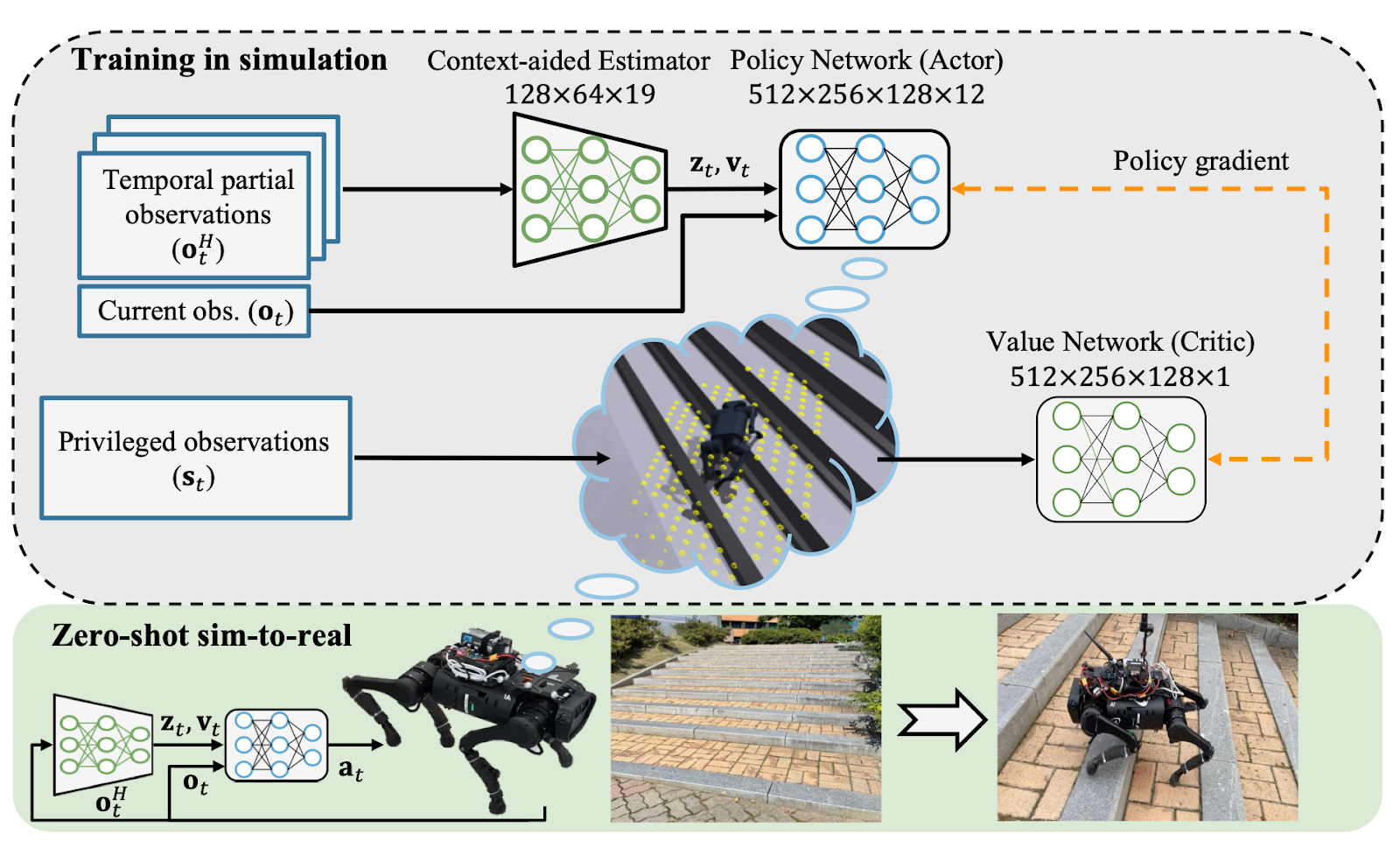 And so it means that on the real robot, even though this is a fully blind policy, usually for these small quadrupeds, they struggle with stairs when blind, because they’ve got to pick their feet very high up. Through interacting with the environment, it’s able to estimate that there is a stair here, and navigate that even without explicit observation of the environment. That’s pretty impressive.
