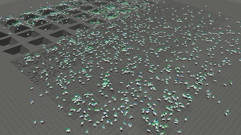 If you’re getting less than 50%, then maybe bump it back down to the easier environment so it can practice there. And so you can see that for this somewhat flat ground, where you just have the steps or the random variation. In this example, they have robots spanning the entire terrain space. In these much harder pyramids and pits they’re very much overrepresented in these easier levels, but the policy has not increased in capability enough yet to put it in the harder parts of the terrain.